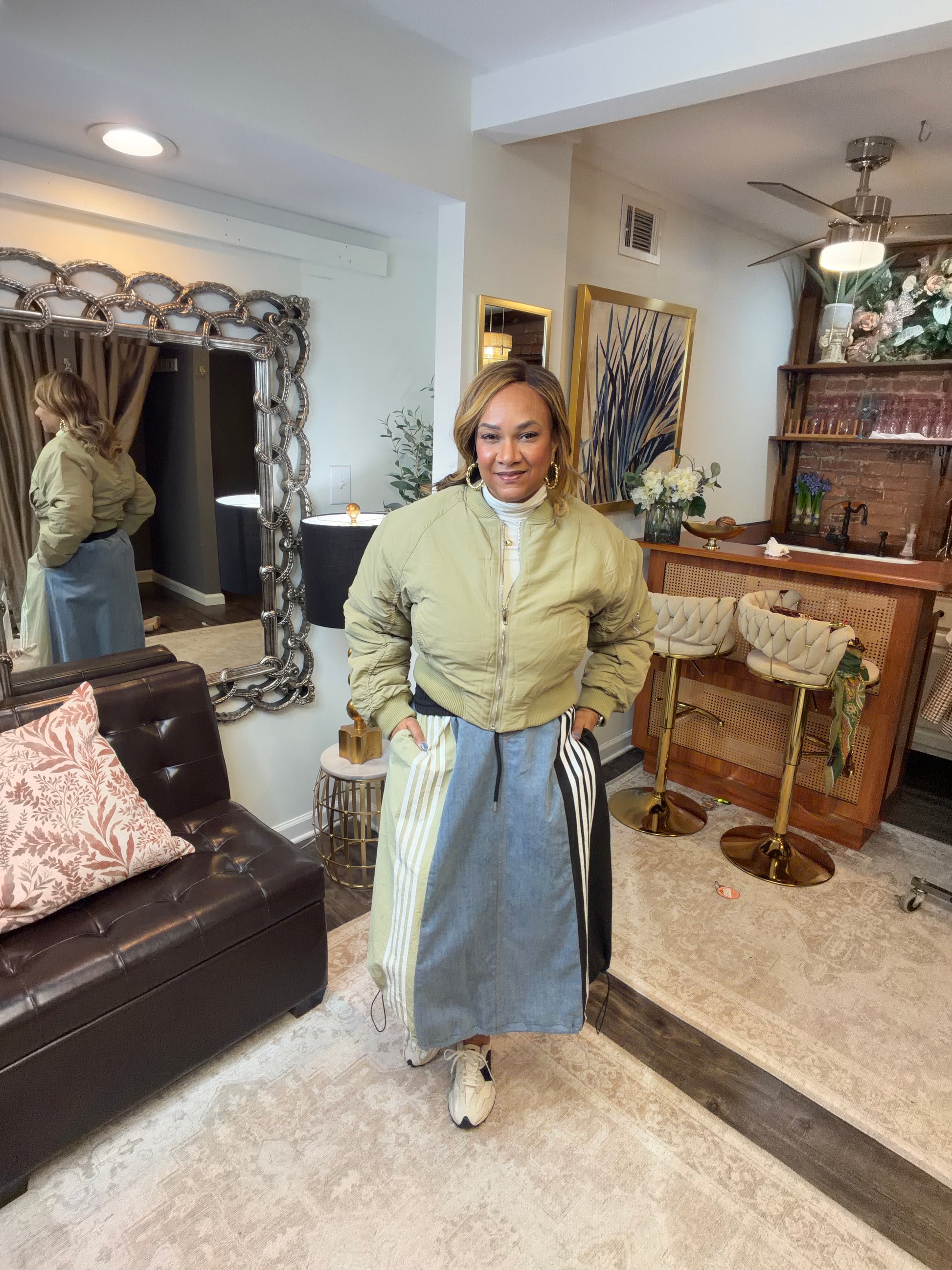 Drawstring waist denim midi skirt with color contrast, side pockets, drawstring bottom hem.