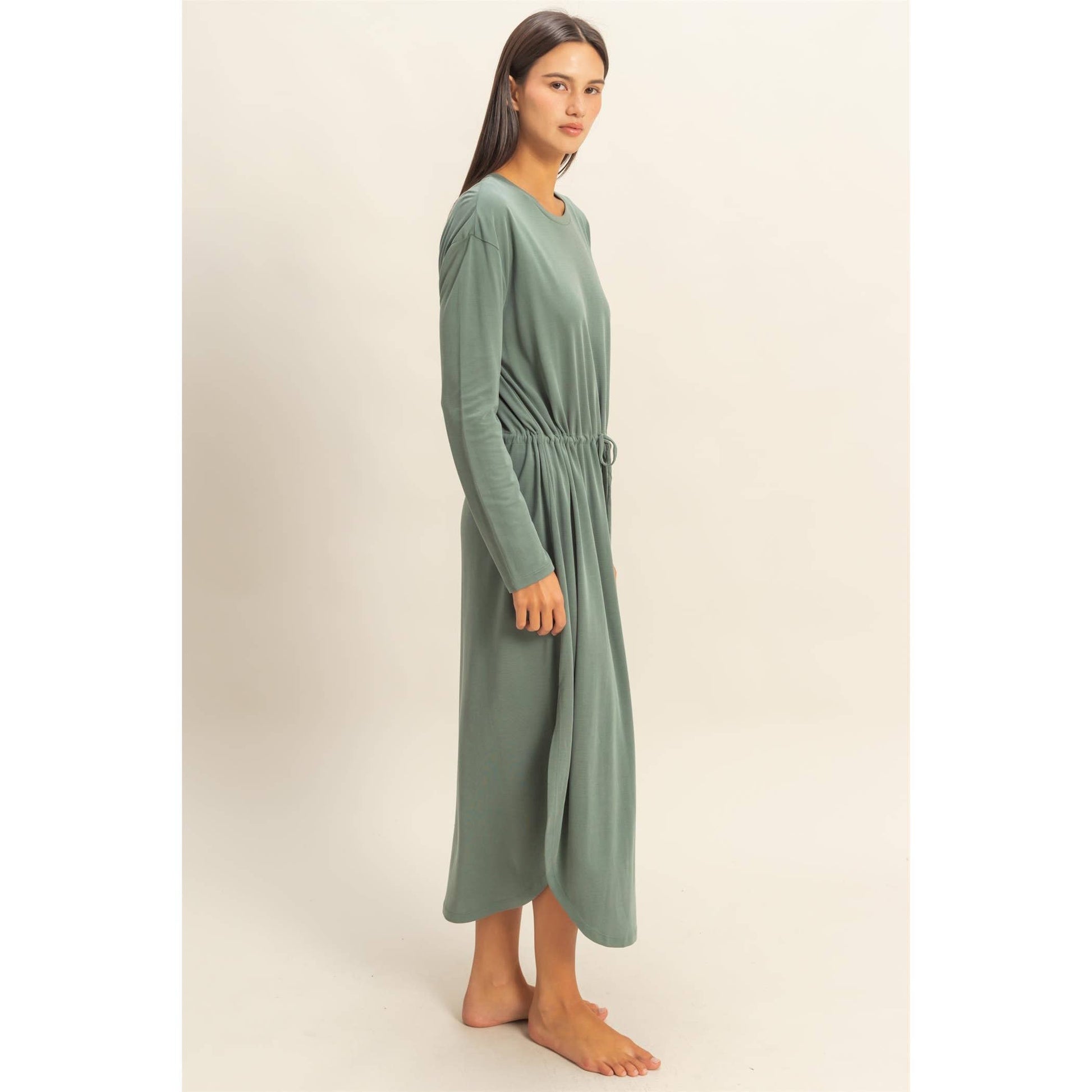 Drawstring Waist Long Sleeve Midi Dress: DEEP POND