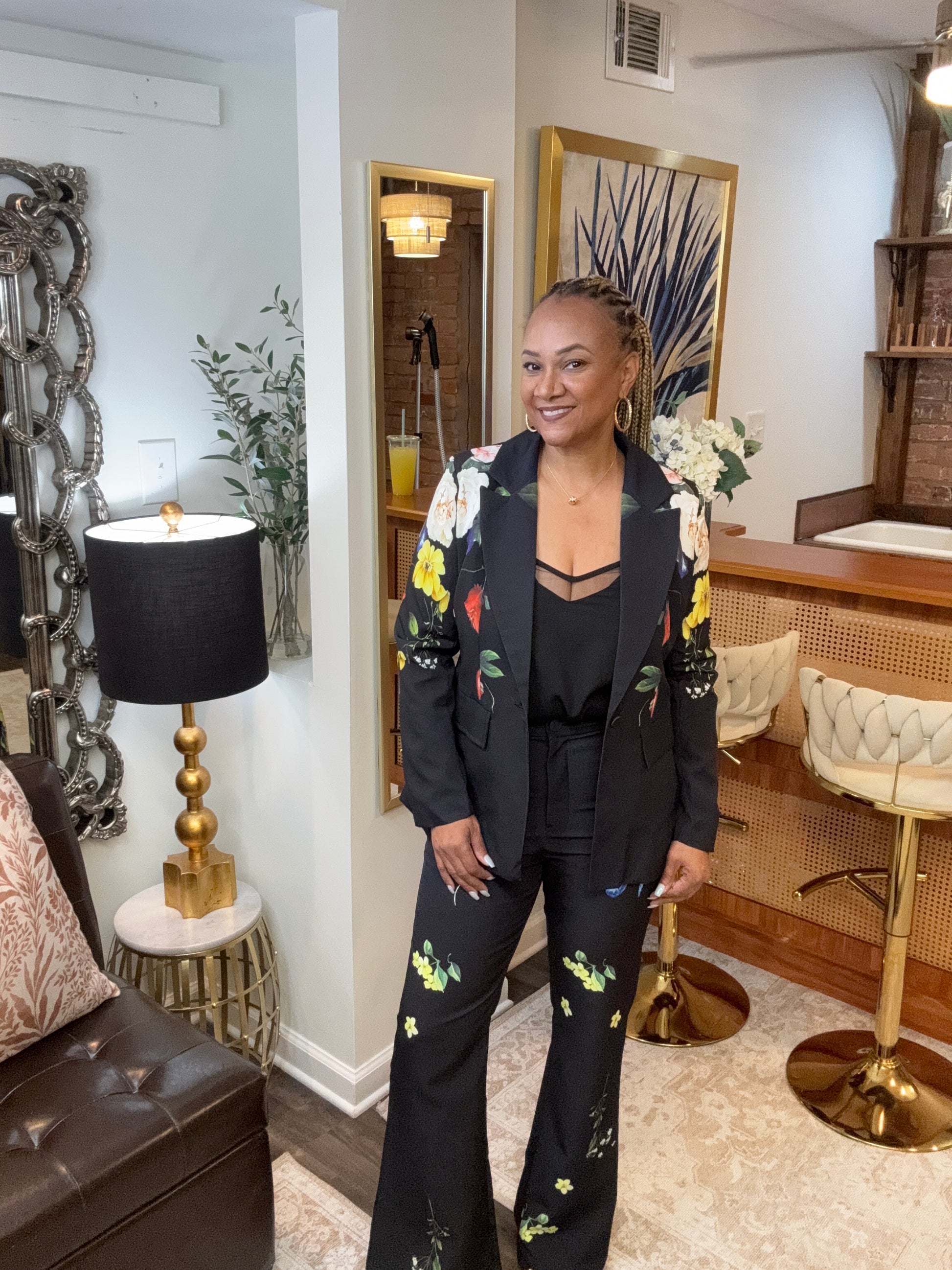 Step out in style with this floral print jacket and pant set. The fully lined jacket features a collar, long sleeves, shoulder pads, covered buttons, and front pockets.