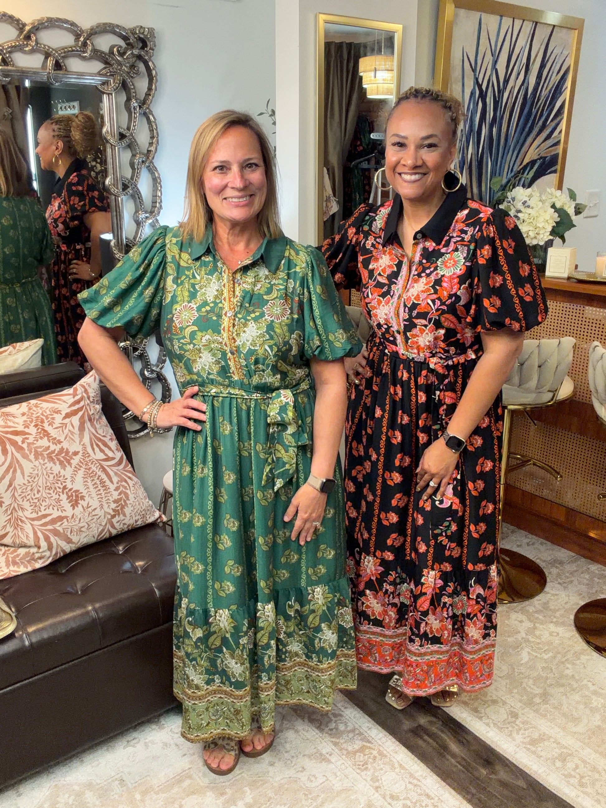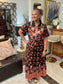Botanical print short puff sleeve midi dress featuring contrast trim front button closure, shirt collar, pleated bodice, elasticated at waist with adjustable tie. Side pockets. Lined. Woven. Non-sheer. Lightweight.